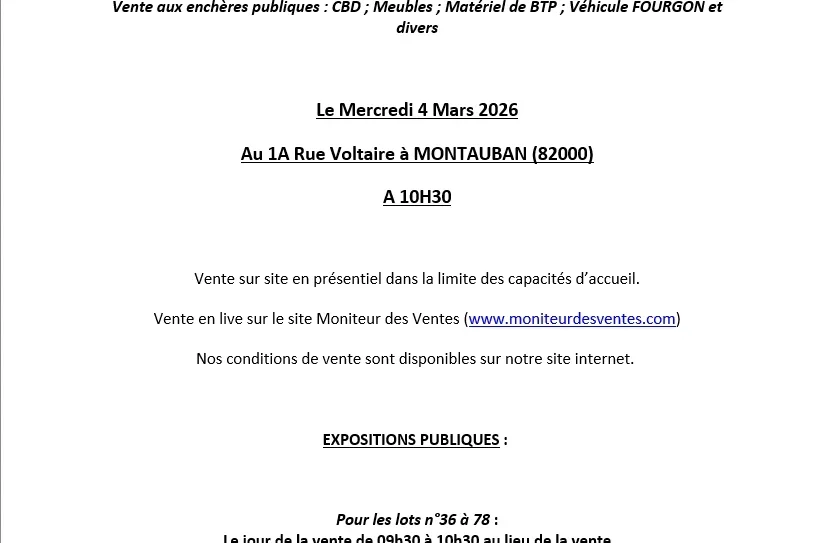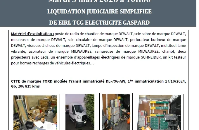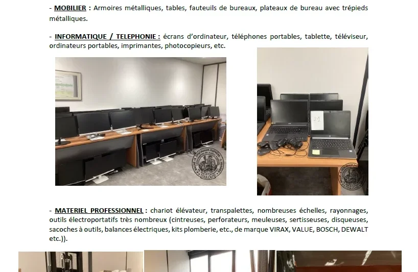 Mobilier, informatique, téléphonie, matériel professionnel, stocks variés, véhicules