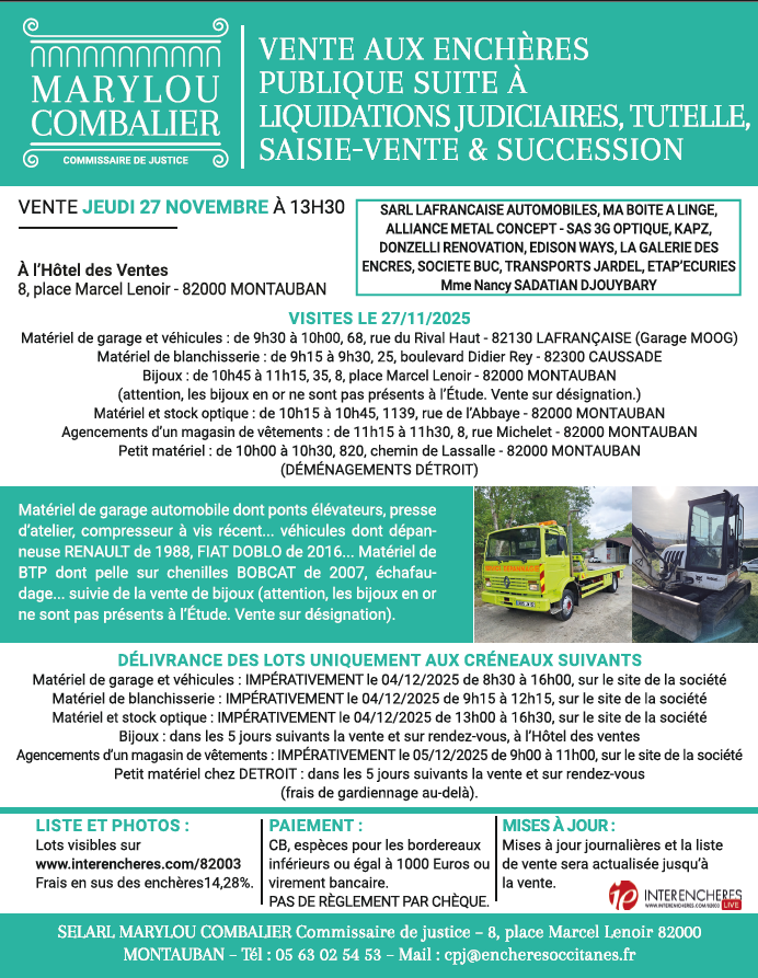 Matériel de garage automobile dont ponts élévateurs, presse d’atelier, compresseur à vis récent... véhicules dont dépanneuse RENAULT de 1988, FIAT DOBLO de 2016... Matériel de BTP dont pelle sur chenilles BOBCAT de 2007, échafaudage... suivie de la vente de bijoux (attention, les bijoux en or ne sont pas présents à l’Étude. Vente sur désignation).