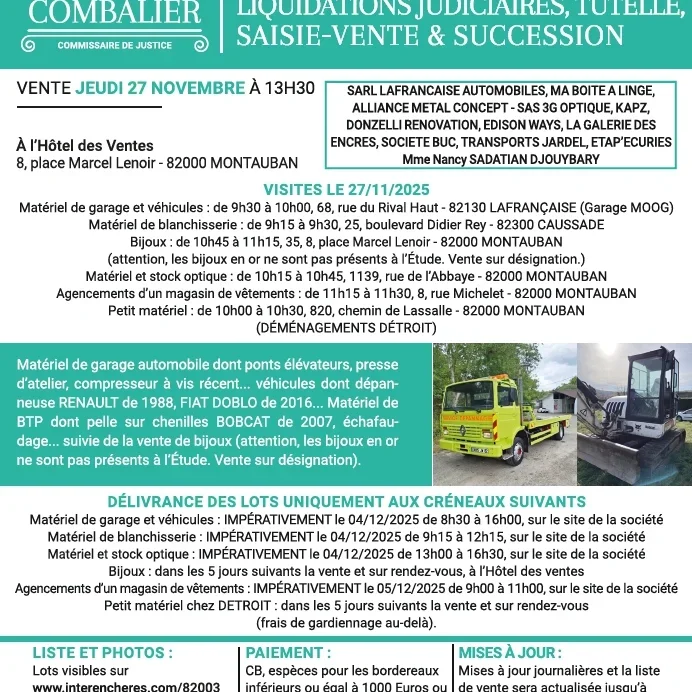 Matériel de garage et véhicules : IMPÉRATIVEMENT le 04/12/2025 de 8h30 à 16h00, sur le site de la société