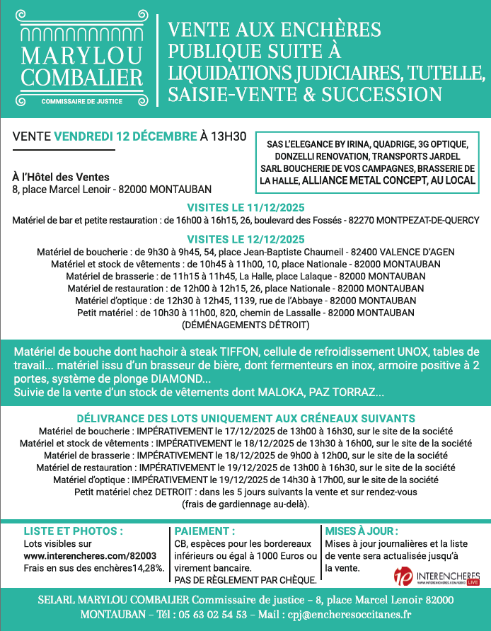 A l’Hôtel des Ventes - 8, place Marcel Lenoir - 82000 MONTAUBAN