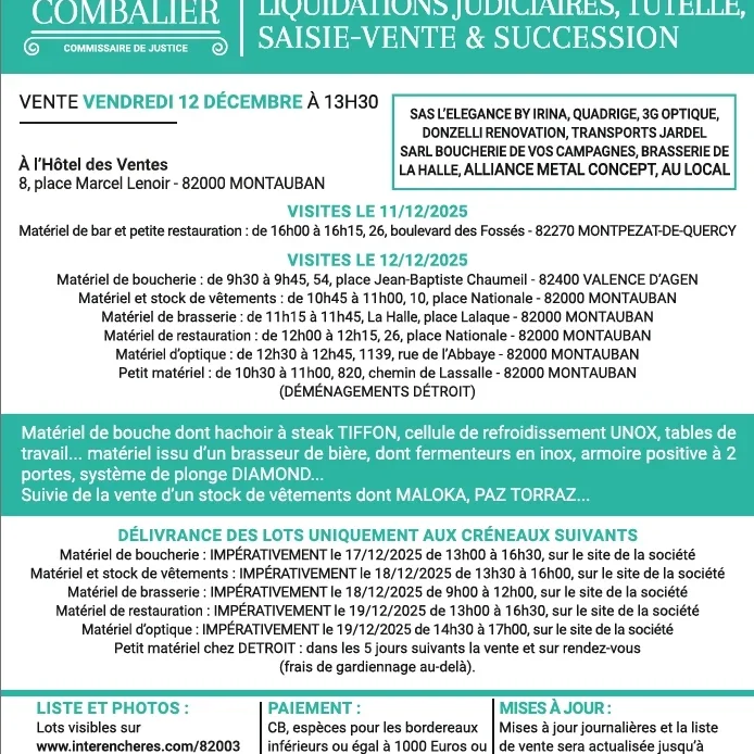 Matériel de boucherie : IMPÉRATIVEMENT le 17/12/2025 de 13h00 à 16h30, sur le site de la société