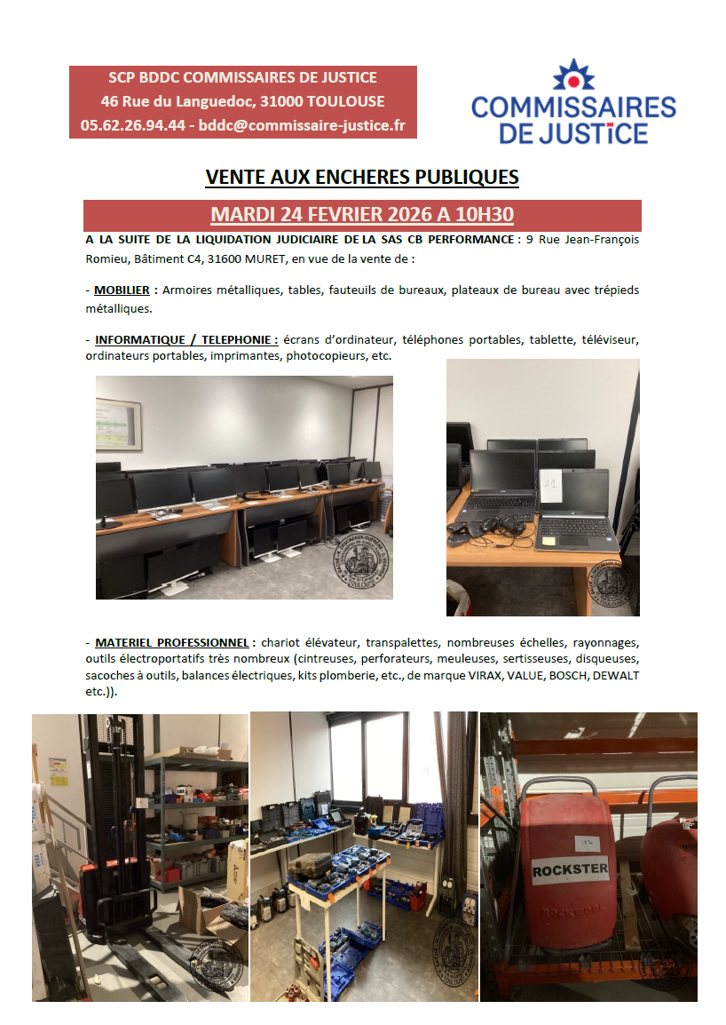 A LA SUITE DE LA LIQUIDATION JUDICIAIRE DE LA SAS CB PERFORMANCE : 9 Rue Jean-François Romieu, Bâtiment C4, 31600 MURET, en vue de la vente de :