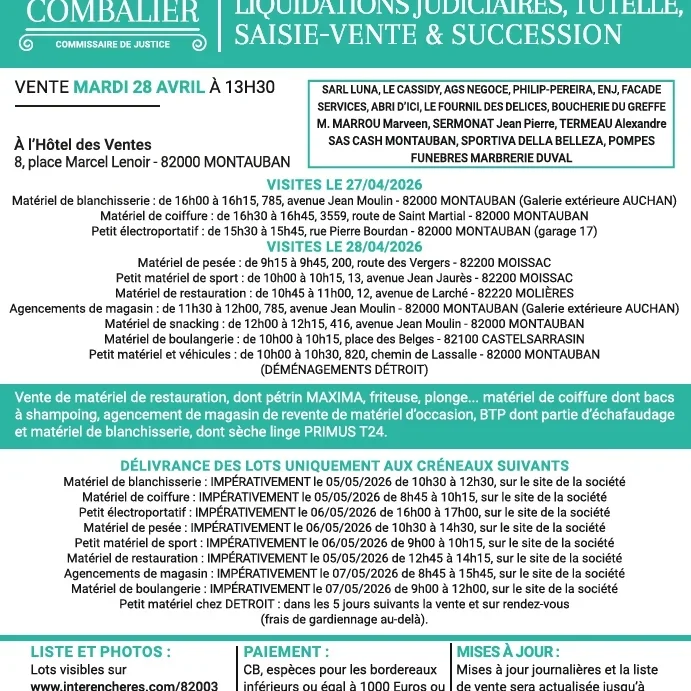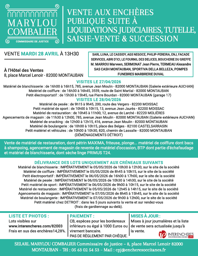VENTE AUX ENCHÈRES PUBLIQUE SUITE À LIQUIDATIONS JUDICIAIRES, TUTELLE, SAISIE-VENTE & SUCCESSION