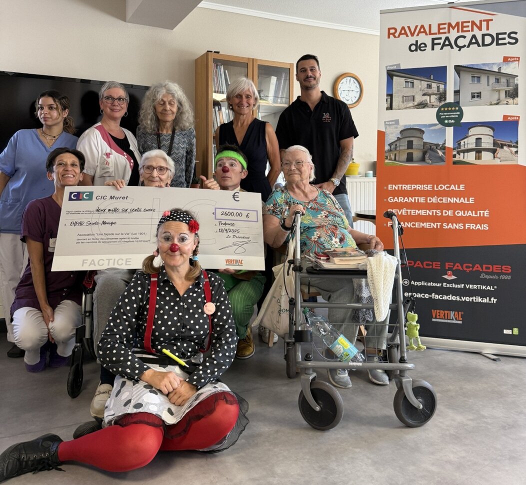 Espace Façades, applicateur exclusif des produits Vertikal en Haute-Garonne et spécialiste de la rénovation de façades de maisons individuelles et petits collectifs, a remis un chèque de 2 600 € à l’Ehpad Sainte-Monique de Toulouse. Ce don permettra de financer quatre interventions de la compagnie de clowns « Les Envolées », intégrées au projet de la structure de développer des animations à visée thérapeutique non-médicamenteuse au profit des résidents. Cette nouvelle action solidaire, menée au travers de l’association "Une façade sur la Vie" créée par le groupement d’entreprises Vertikal et dont Espace Façades est membre, porte à 38 600 € le montant total des dons réalisés par l’entreprise toulousaine depuis 12 ans.